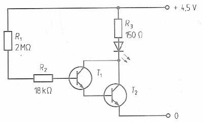 statt R1 kann man auch Metallplätchen nutzen um mit den Fingern den Widerstand zu überbrücken -> die LED leuchtet